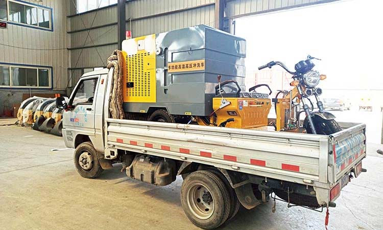 石家庄环卫公司订购三轮高温高压清洗车发货现场,该车水温可加热到90℃,热水模式对于清理城市小广告、清理重油污、冲洗垃圾桶、冲洗广场地面、冲洗公交站台花砖等效果明显,冷水模式主要用于城市人行道和辅道的快速冲洗和保洁。车辆体积小巧,通过性强,且不会对人行道地砖、井盖等其他公共设施造成损坏。